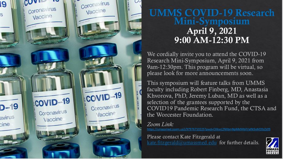 We cordially invite you to attend the COVID-19 Research Mini-Symposium, April 9, 2021 from 9am-12:30pm. This program will be virtual, so please look for more announcements soon. This symposium will feature talks from UMMS faculty including Robert Finberg, MD, Anastasia Khvorova, PhD, Jeremy Luban, MD as well as a selection of the grantees supported by the COVID19 Pandemic Research Fund, the CTSA and the Worcester Foundation. Zoom Link: https://umassmed.zoom.us/j/97976710225?pwd=OXkwL2NXbmNpMklWbXVaRk5oM20zZz09 Please contact Kate Fitzgerald at kate.fitzgerald@umassmed.edu for further details.Friday, April 16, 2021