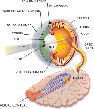 The eyeball is located at a strategic position to ensure maximum light detection while securely positioned in the cavity of the orbit. It is largely divided into anterior and posterior chambers. The light enters the anterior part of the eye, which includes the cornea and the pupil, and passes through the lens to the posterior part of the eye, which is the retina; here, it activates a complex set of events. The retina then projects the signal via the optic nerve to the lateral geniculate nucleus (LGN) in the brain.
