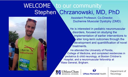 Dr. Chrzanowski was inspired in his childhood sharing, “I witnessed my best friend’s older brother who had DMD, and the family manage his illness, and the lack of treatment available for him. This led me to volunteer in the summer Muscular Dystrophy Association camps, assimilating me into the neuromuscular family. With incredible mentors from undergraduate to UMass Chan, I have been fortunate to be able to have an opportunity to be a part of history as we redefine the trajectory of this terrible illness.”