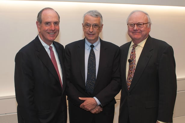 Chancellor Michael F. Collins (left) and professor of biochemistry & molecular pharmacology Thoru Pederson (right) were among those honoring Warner Fletcher at the annual meeting of the Hudson Hoagland Society.