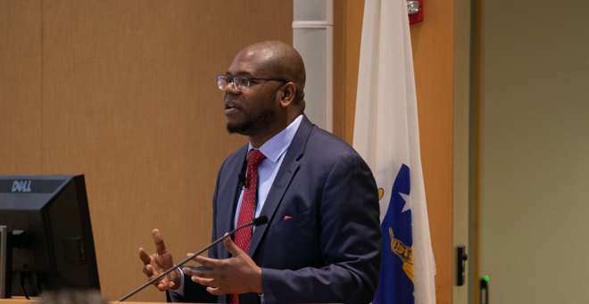 Keynote speaker Jason Johnson, PhD, professor of politics and journalism at Morgan State University, addressed a standing room only crowd in the Faculty Conference Room Monday afternoon, and asked that they not ride the moral arc in hopes that it leads to justice, but to instead take an active role in breaking the historical cycle of oppression and discrimination in the United States.