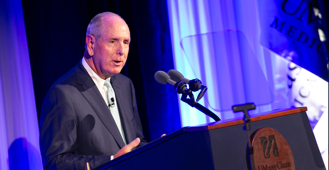 Collins announced the start of the public phase of “Advancing Together: The Campaign for UMass Chan Medical School,” a fundraising initiative with a goal of raising $500 million by late June 2026. The campaign, which started in 2019, raised $350 million in the silent phase. The Advancing Together marketing campaign was launched on Sept. 6, celebrating UMass Chan’s “unique culture of collaboration.”