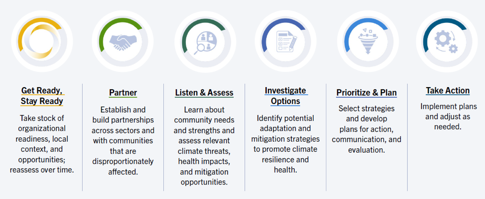 The Building Resilience Against Climate Effects (BRACE) framework is comprised of six key elements that guide public health officials and community partners through a collaborative process to improve health and wellbeing through climate action.