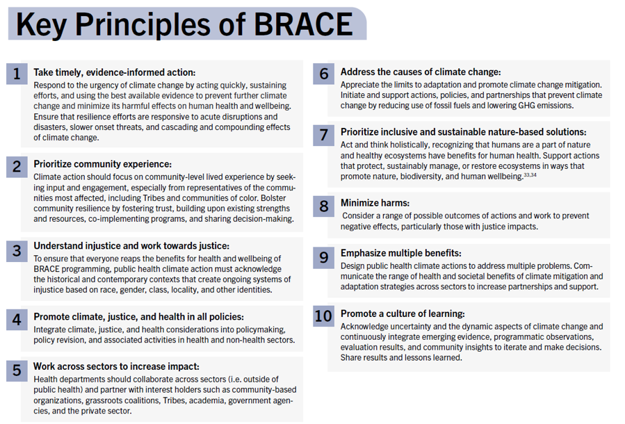 Ten key principles inform BRACE and are intended to guide public health climate action. Practitioners are invited to use these principles as the foundation of their own efforts. Alternatively, these principles can serve as a starting place for BRACE teams that may want to develop new key principles to guide their efforts.