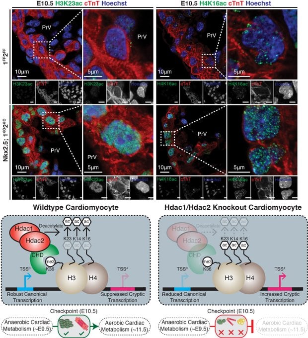 Our recent study identifies a causal relationship between Congenital Heart Disease (CHD), the most common developmental defect in children, and defective developmental energy generation (Science Advances). We demonstrated that two class I histone deacetylases, Hdac1 and Hdac2, silence cryptic transcription to promote mitochondrial function in developing murine hearts. Cryptic transcription is observed in lower organisms and mammalian cell lines, yet no reports describe cryptic transcription in a vertebrate system. This report is the first link between chromatin-modifying enzymes and cryptic transcription during vertebrate development and the first to link cryptic transcription and energy production during cardiogenesis.